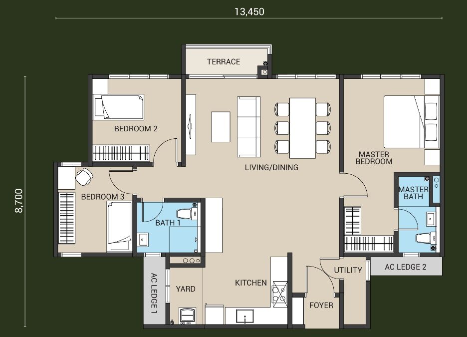 Unit layout: 3 bedrooms, 2 bathrooms, 1 utility room ; Unit built-up area: 1,080 sq ft