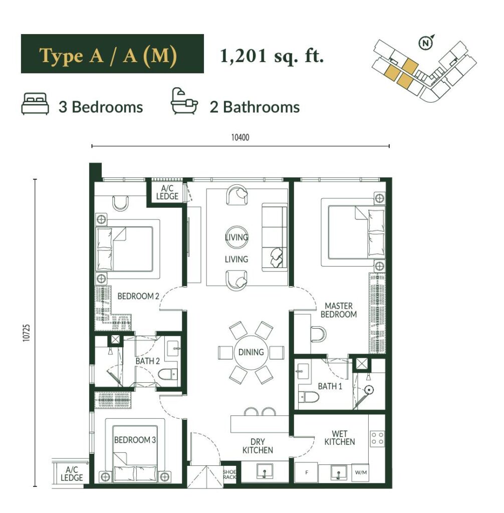 Type A : 1,201 sq ft3 Bedrooms, 2 Bathrooms