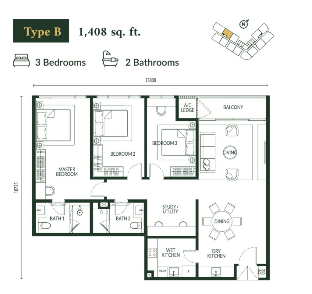 Type B : 1,408 sq ft3 Bedrooms, 2 Bathrooms