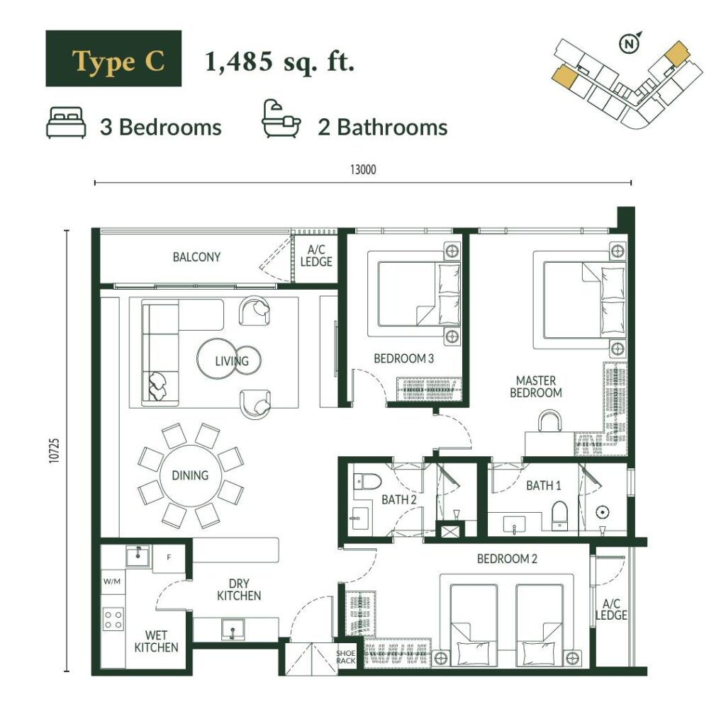 Type C : 1,485 sq ft3 Bedrooms, 2 Bathrooms