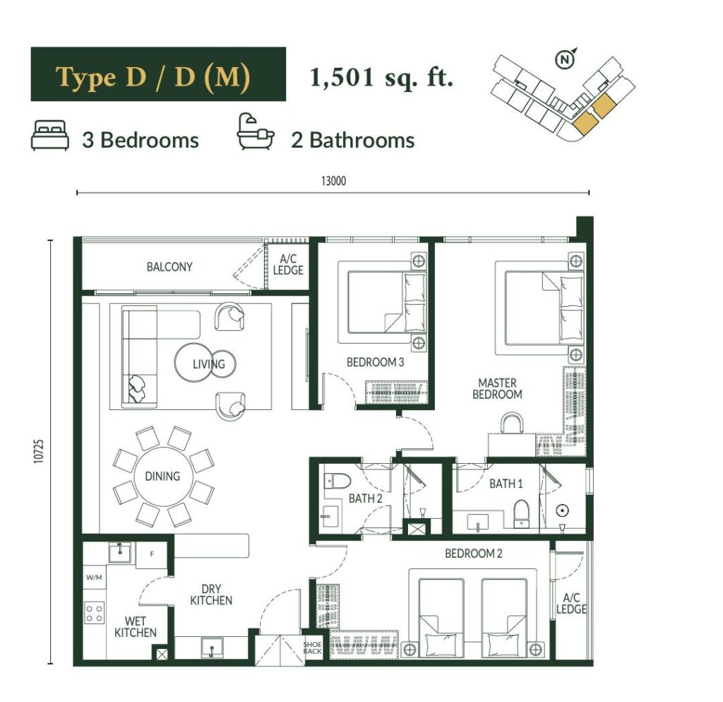 Type D : 1,501 sq ft3 Bedrooms, 2 Bathrooms