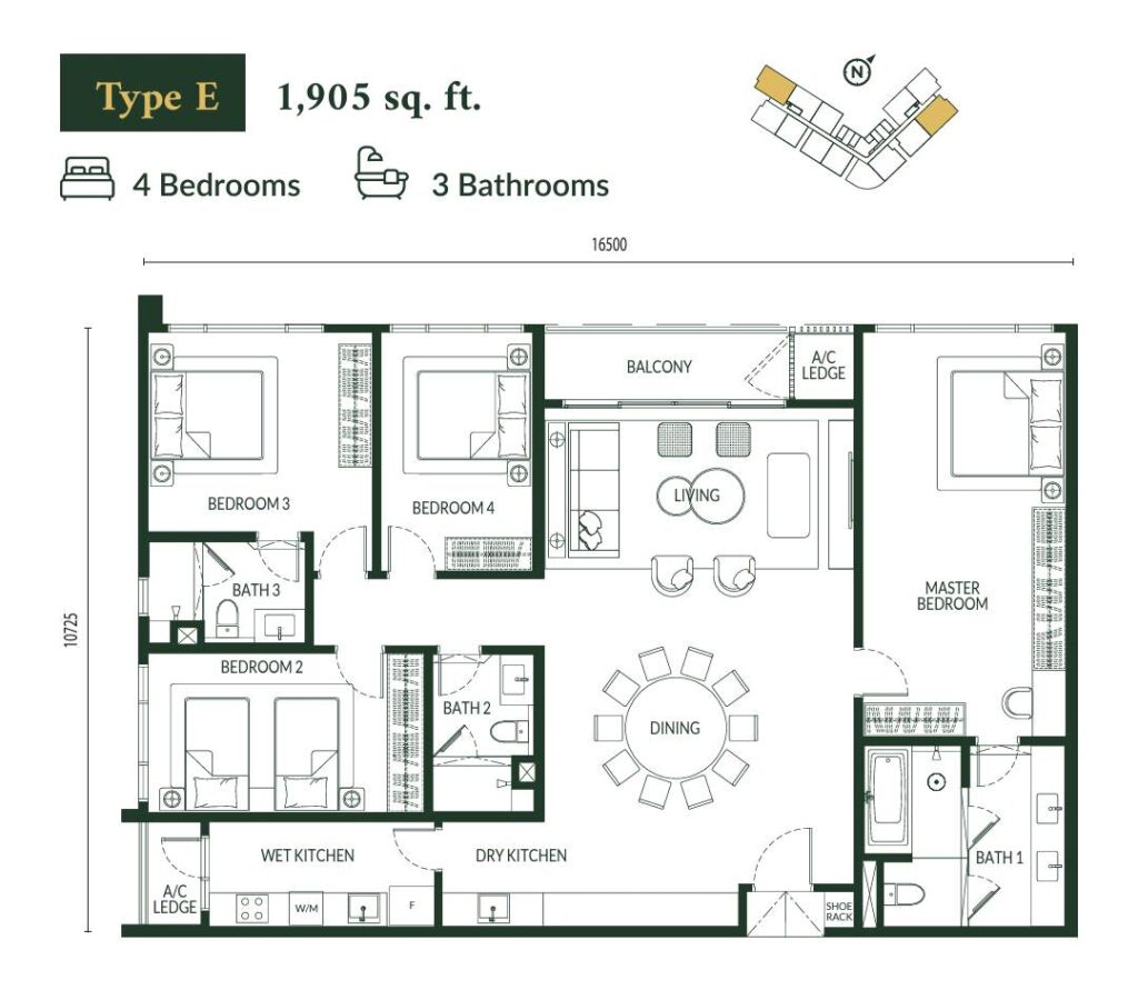 Type E : 1,905 sq ft4 Bedrooms, 3 Bathrooms