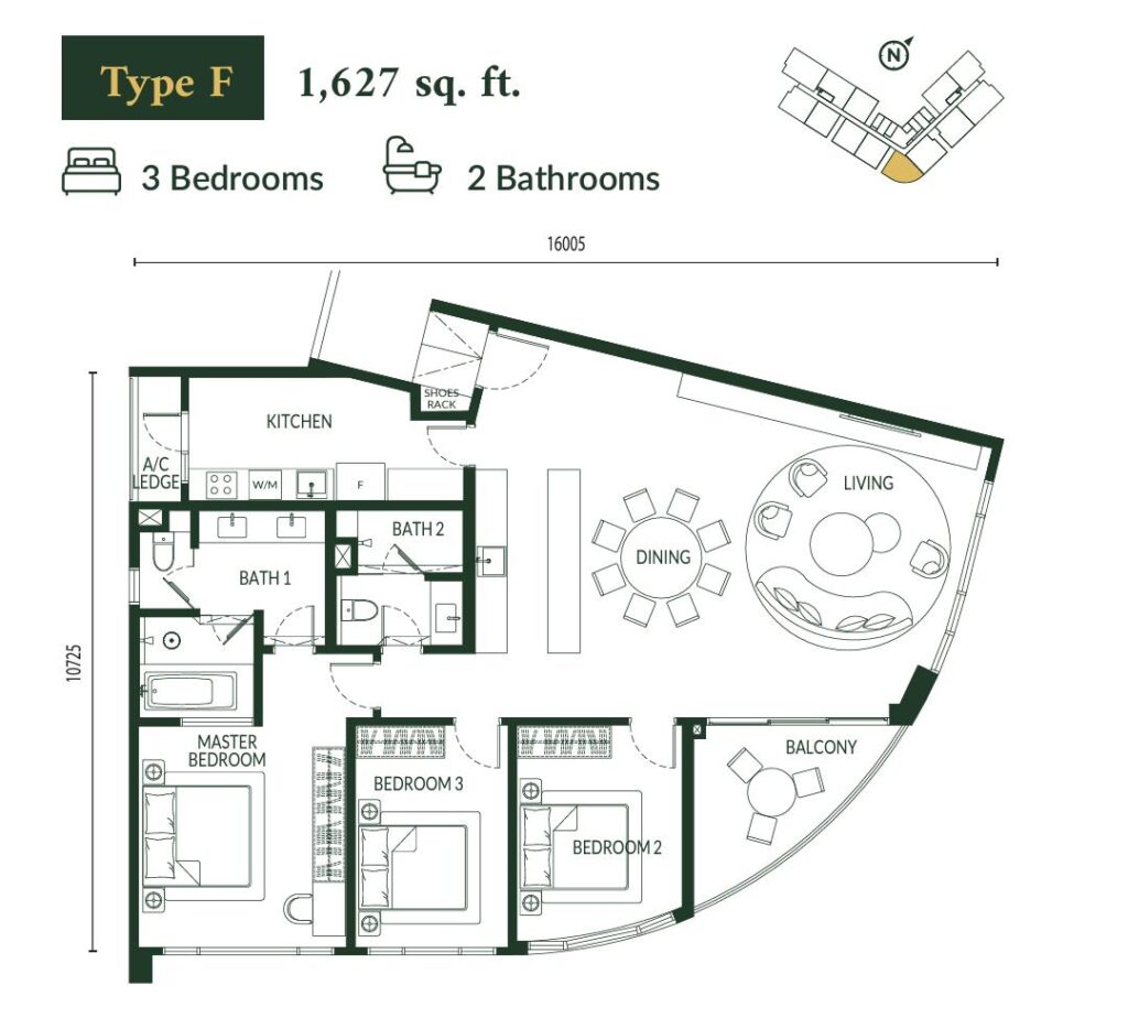 Type F : 1,627 sq ft3 Bedrooms, 2 Bathrooms