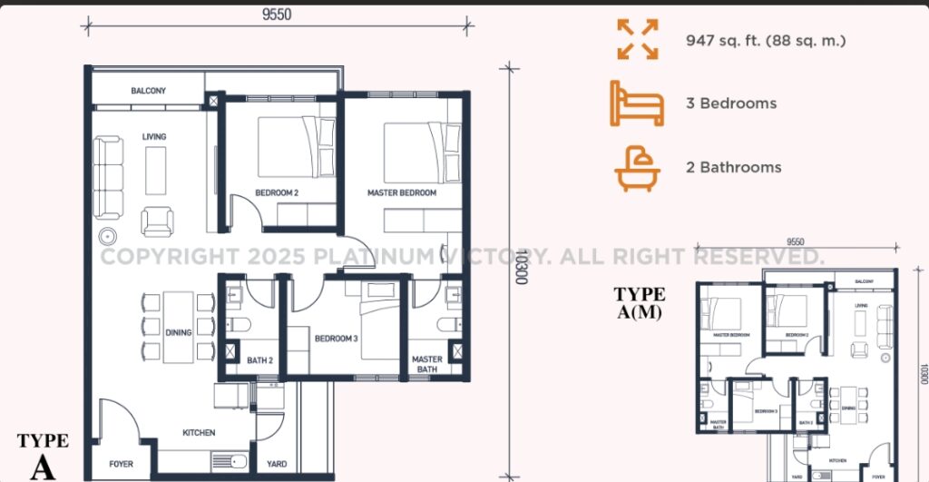 Type A : 947 sq ft | 3 rooms + 2 baths |