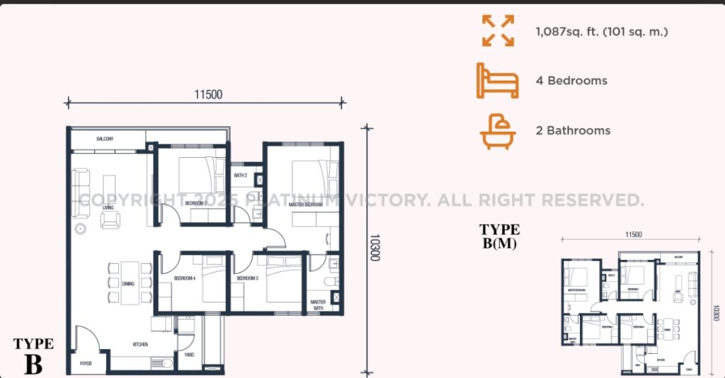 Type B : 1,087 sq ft | 4 rooms + 2 baths |