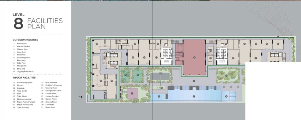 Facilities | At Level 8 and Rooftop with over 30 types of lifestyle facilities – Infinity pool, aqua gym, jogging path, yoga studio, urban farming area, and more. |